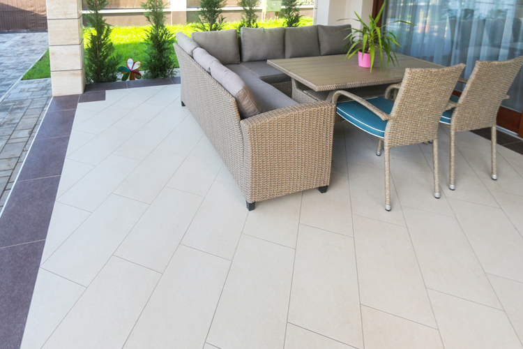 A saroktelekre épült ház udvarának a zöld területe jól harmonizál a Semmelrock Citytop szürke térkövével. Az 500 m2 nagyságú udvaron sikerült megtalálni az összhangot, a kerti pihenő rész mellett elegendő zöldterületet láthatunk. A ház külső megjelenése stílusos, színösszeállítása, nagy méretű ablakai hangulatos otthon benyomását keltik. A tetőn a Bramac Tectura Protector ébenfekete színű cserepe látható. A nyitott terasz hidegburkolata a Zalakerámia Rock Beige és Brown lapjai.