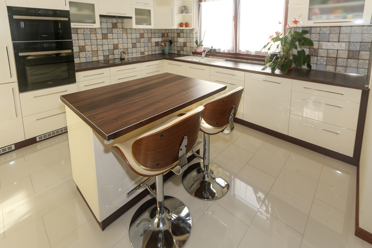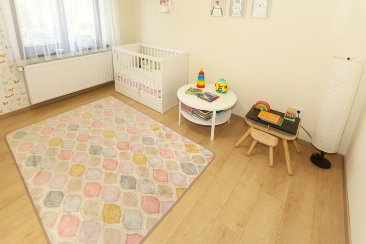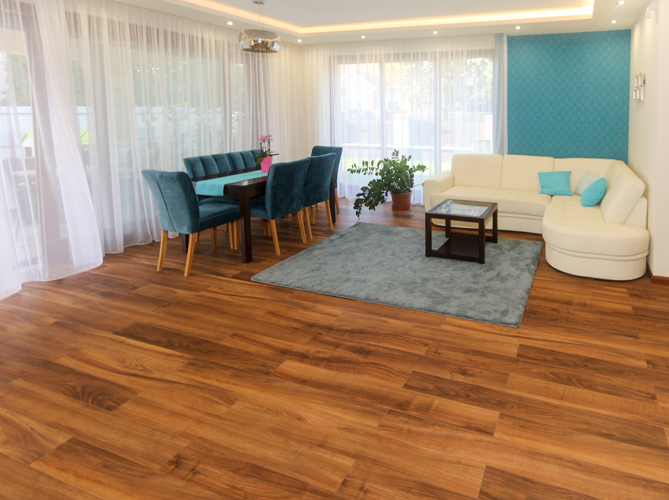 A házban HARO OAK Italian Walnut melegburkolatot választottak, amely otthonos hatást kölcsönöz a nappali, étkező résznek. A kiváló minőségű HARO laminált parketták az autentikus fapadló kinézetükkel minőségi és természetes benyomást keltenek. A padló sötét tónusát jól kiküszöbölik a világos falak. A családi élettér központját jelentő nappaliban a falra Géta Titanium 2 tapéta is került, amely színvilága több kiegészítőben is megjelenik ezáltal egységes összképet kapunk. A konyha falán a Zalakerámia Carneval falicsempéjét láthatjuk. A mogyoró barna, fehér és türkiz színvilágba remek döntés volt ez a lap. A padlóra az Arte Casa Urbe Bianco 30×60-as burkolatát választották.