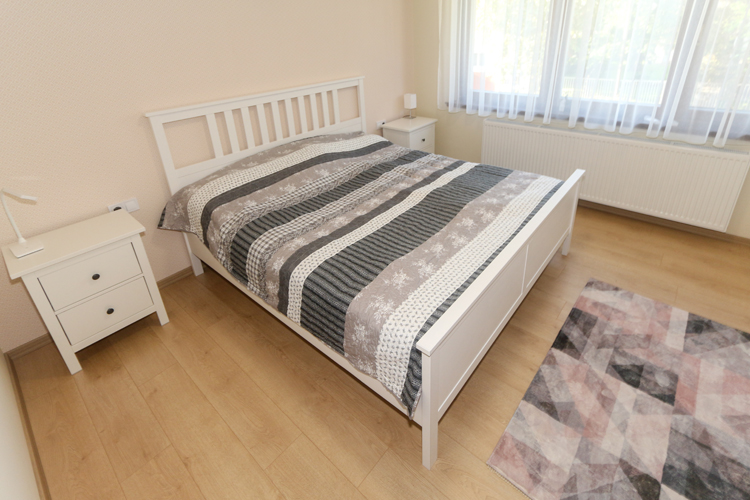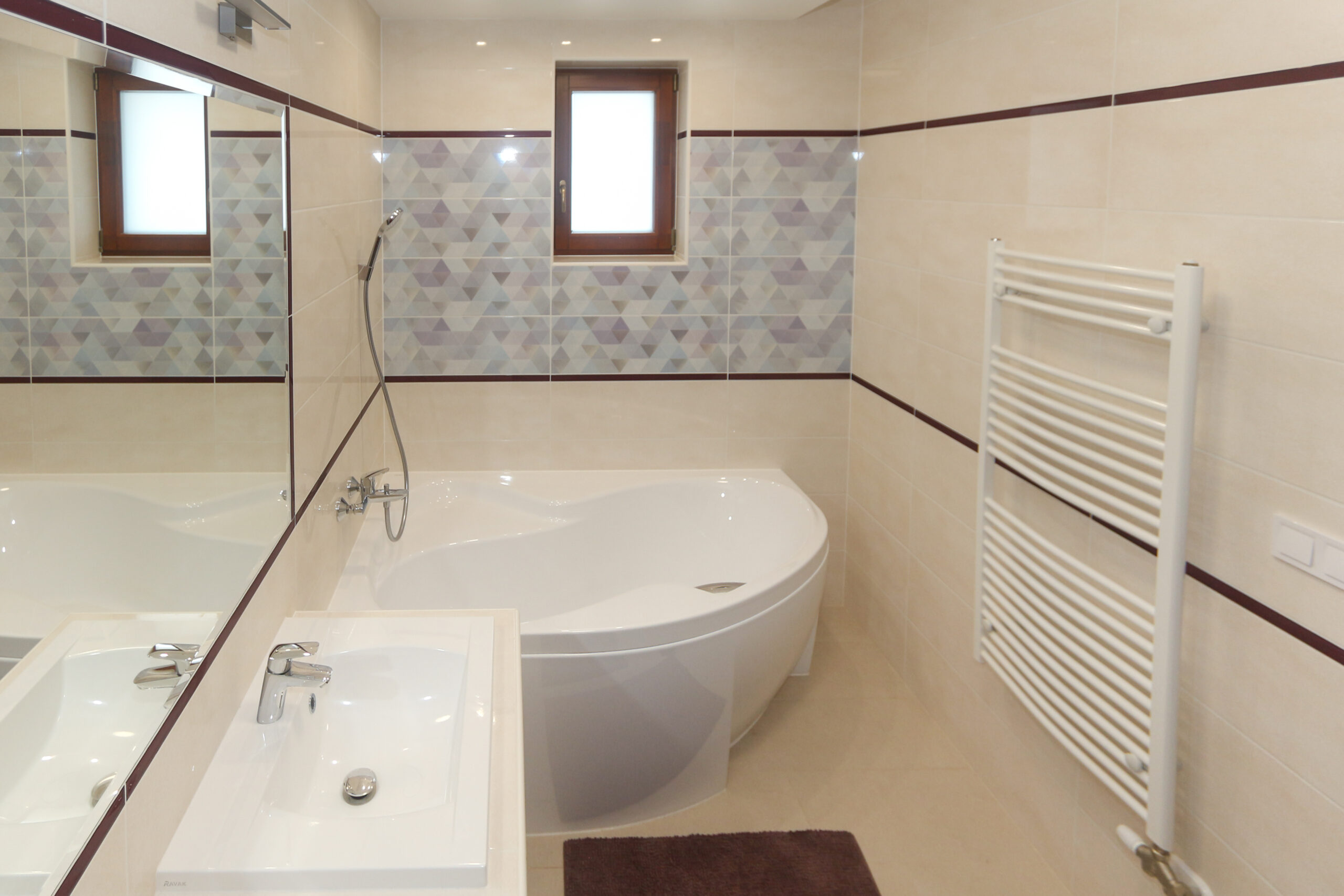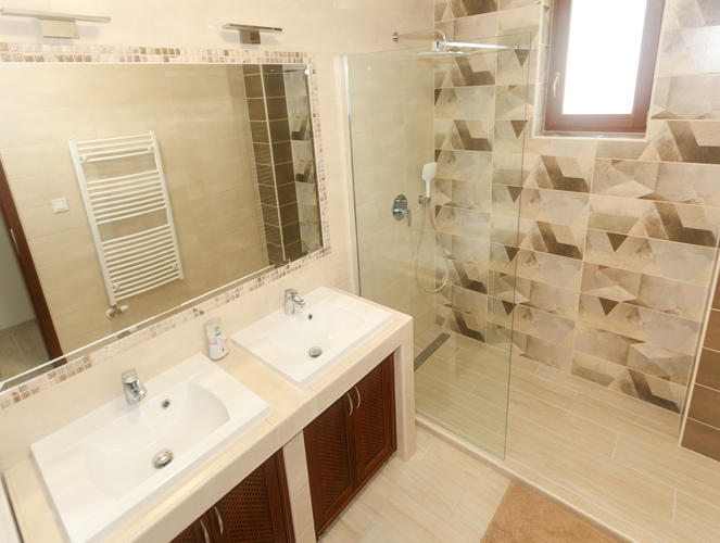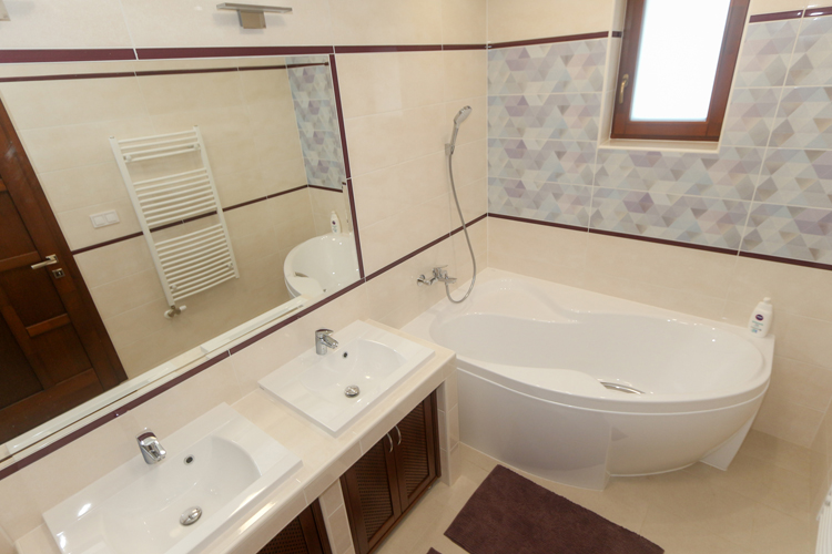 A ház egyik fürdőszobája a földszinten található („Keressük 2020. legszebb fürdőszobáját nyereményjátékunk” nyertese), amelyben a Paradyz gyártó Attiya termékcsalád mellett döntöttek. Az épített zuhanyzó zuhanyfala Rosa Glass márkájú, amely a beépített Ravak Neo kéziváltóval, csapteleppel, esőztetővel lett szerelve. A Ravak Classic 600 fehér mosdókagylók épített pultba Hansgrohe Logis 70 csaptelepekkel párban láthatóak. A zuhanyzó melletti falon Radeco törölközőszárítós radiátor található fehér színben. Tovább haladva a mellékhelyiség is leköveti a fürdő burkolatait, stílusát. Itt Ravak Chrome WC Classic, Geberit nyomólappal, Gedy folyékonyszappanadagoló és WC papírtartó szerepel. A helytakarosságból jeles Vento Compact natúr színű fürdőszobaszekrény Hansgrohe Logis 70-es csappal szintén része a helyiségnek. Az emeleti hálószobákban az Egger Light Newbury Oak 4V laminált padlója lett a befutó. Nagy családhoz hűen az emeleten is találunk egy fürdőszobát, aminek a burkolata az Opoczno Geometric game termékcsaládja. Itt a burkolat egységes megjelenését listello dekorral is feldobták, aminek a neve: Glossy Cobalt Border dekor. A földszinti fürdőszobával ellentétben ide kádat építettek be, ami a Ravak Rosa 2 aszimmetrikus akril sarokkádja. A mosdókagylók, csaptelepek, radiátor márkák itt is ugyanazok mint a földszinten.