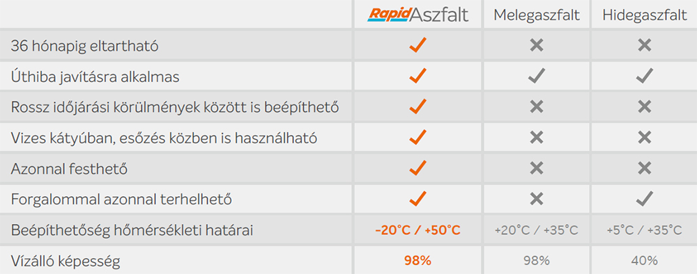 A különböző aszfalt, betonfelületek építéshez, javításához hosszú előkészületi folyamatok befejezése után lehetett hozzá látni, ha azt az időjárási viszonyok engedik. A prémium minőségű Rapid hidegaszfaltnak köszönhetően a csomagolás kibontása után felvihető az adott felületre emulzálók és zúzalékok mellőzése nélkül, mellyel rengeteg idő takarítható meg.