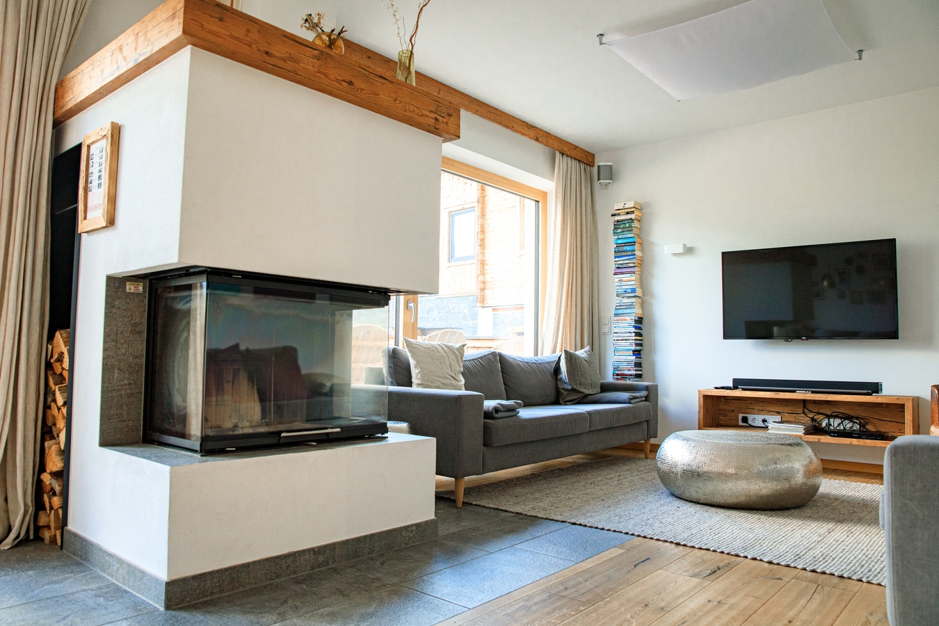 A lobogó kandallótűz melegséget és bensőséges hangulatot kölcsönöz a térnek, tökéletes helyszínt biztosítva a családi és baráti összejövetelekhez.