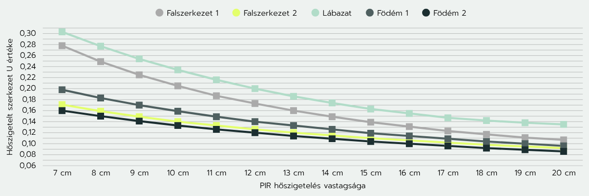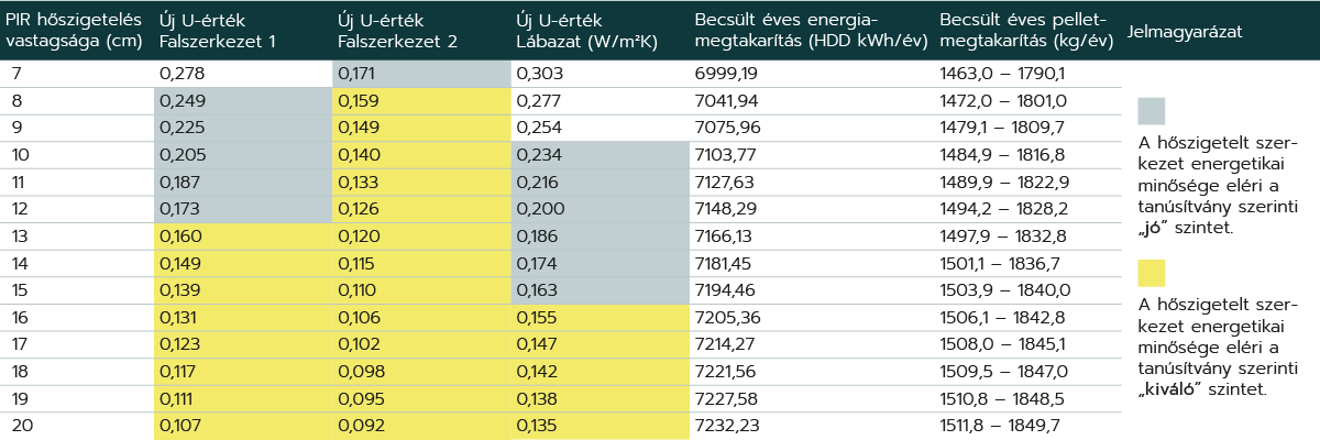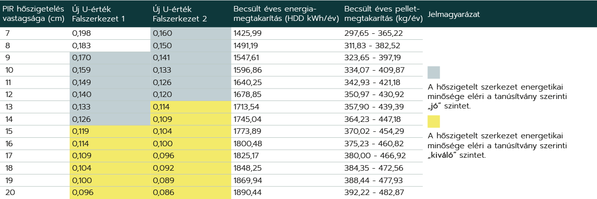 A számításokat az energetikai tanúsítvány adatai alapján végezték, és azt vizsgálták. Nézzük meg milyen hőszigetelés-vastagsággal lehet elérni a „jó” (U = 0,16–0,24 W/m²K) és „kiváló” (U < 0,16 W/m²K) kategóriákat az Innopan PIR táblák felhasználásával.