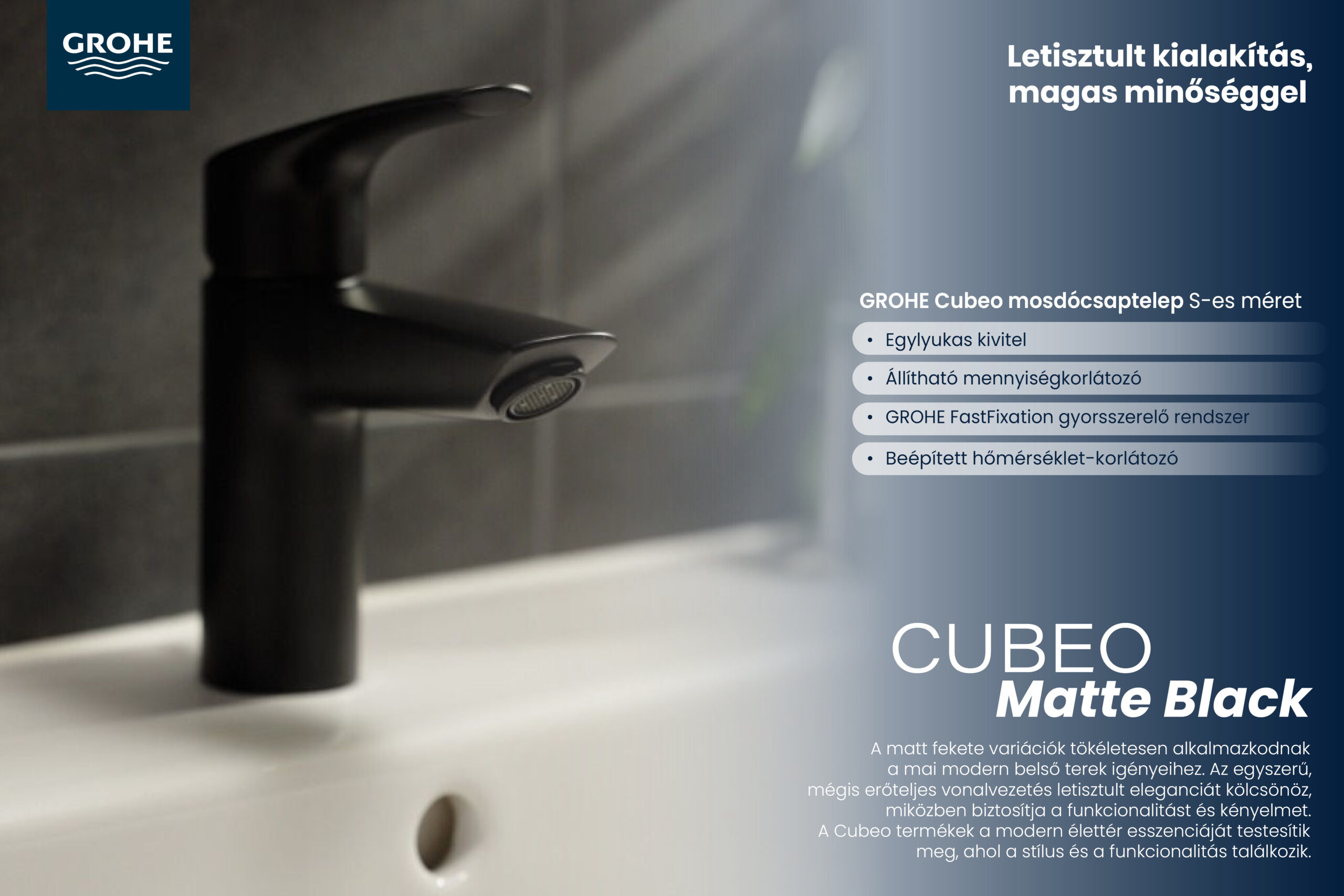 - A Cubeo Matt Black nemcsak látványos, hanem funkcionális is. A GROHE több technológiát is beépített ebbe a sorozatba: